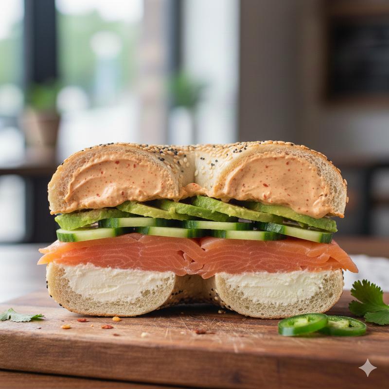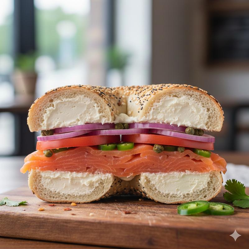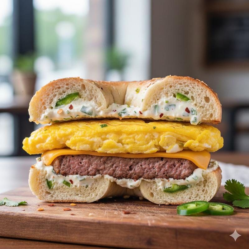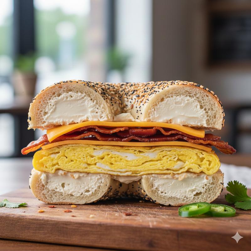 2 eggs or egg white, cheese, and turkey bacon on classic cream cheese.